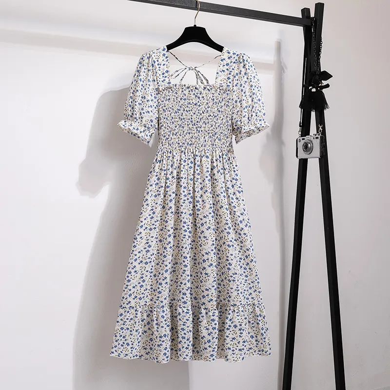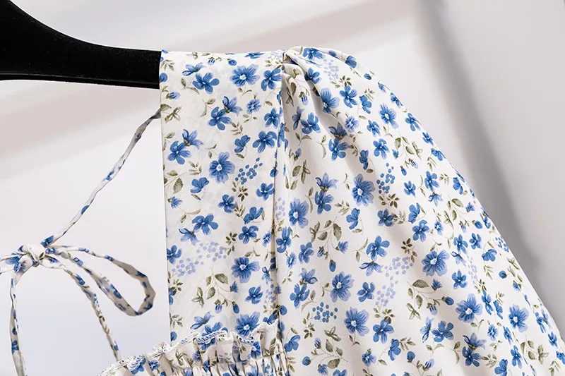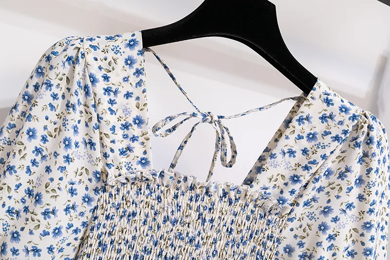 Summer Pleated Women Chiffon Dresses-blue flower